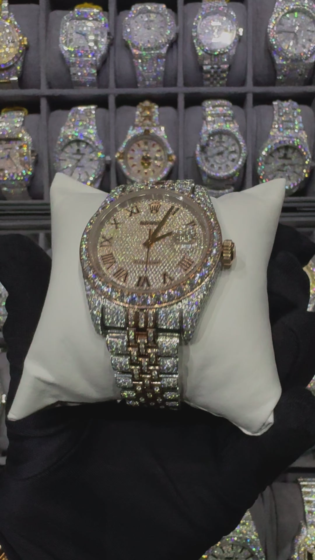 Rose White Round Roman Dial Jubliee Bend Moissanite Diamond Automatic Watch