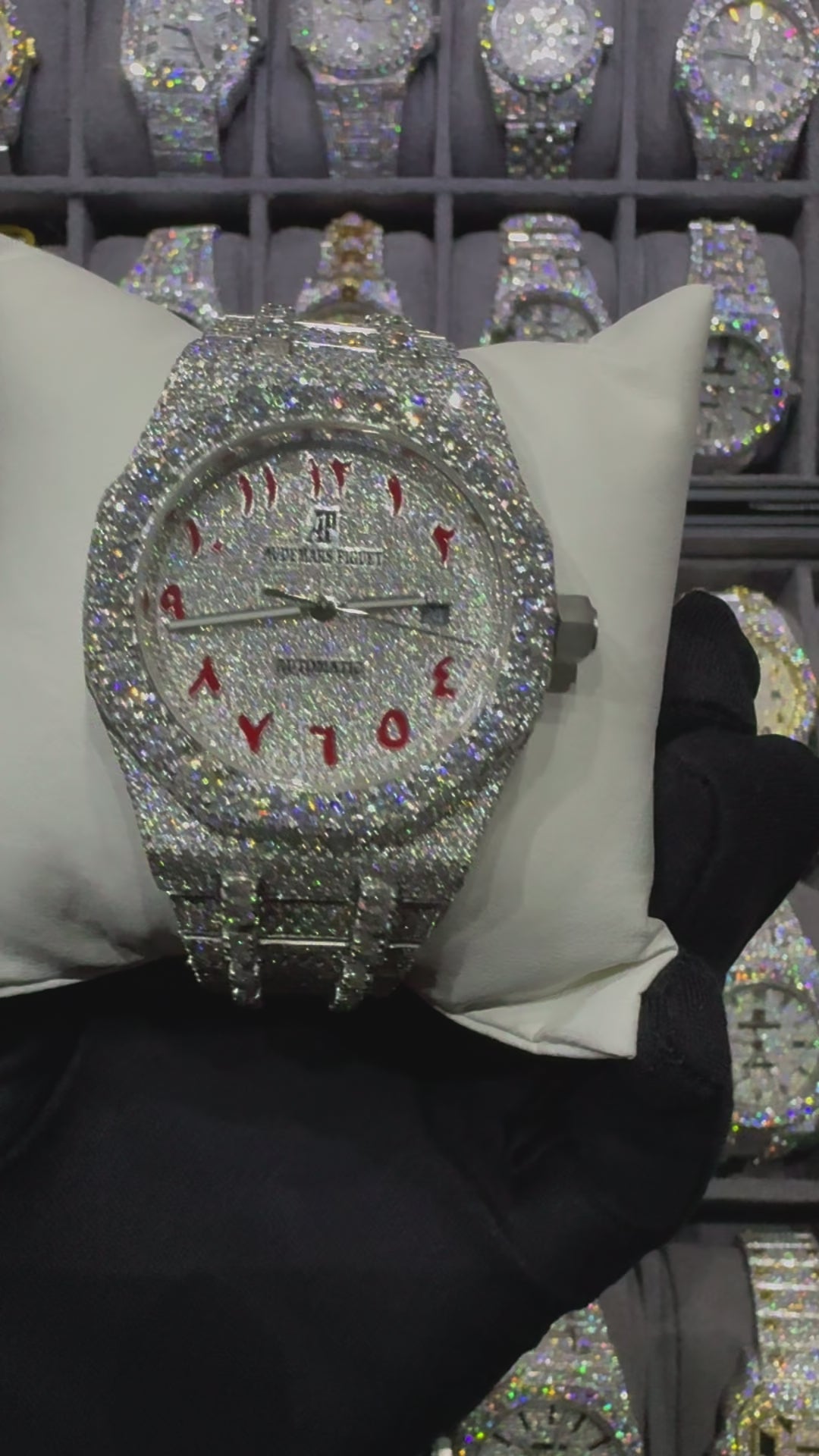 White Red Arabic Round Dial Modified Bend Moissanite Diamond Automatic Watch
