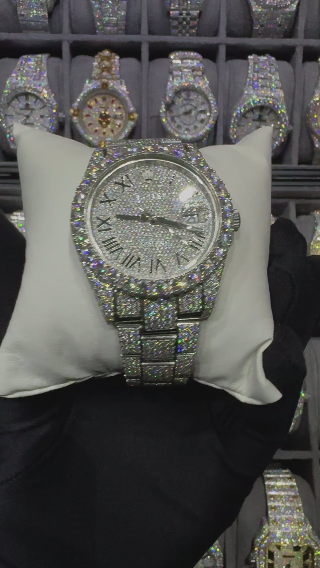 White Round Roman Dial Oyster Bend Moissanite Diamond Automatic Watch