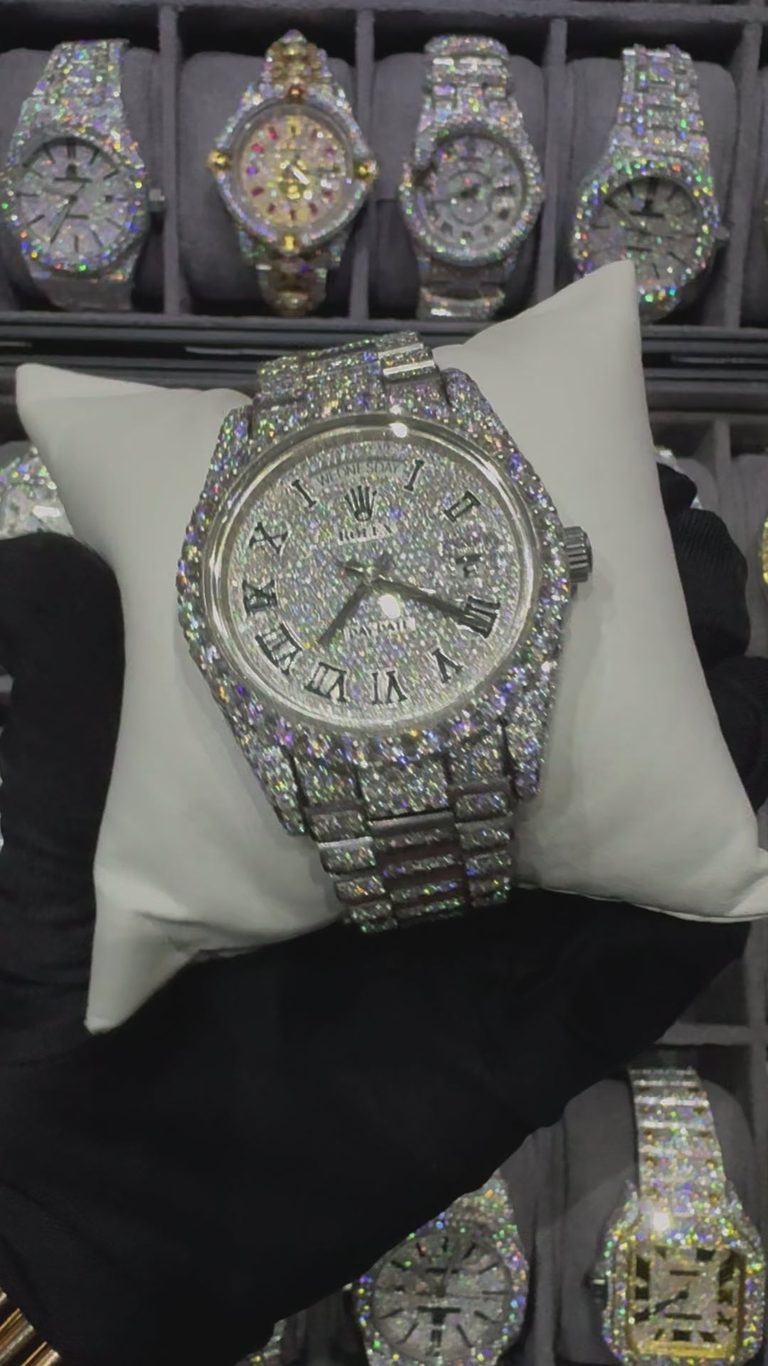 White Round Roman Dial Presidential Bend Moissanite Diamond Automatic Watch