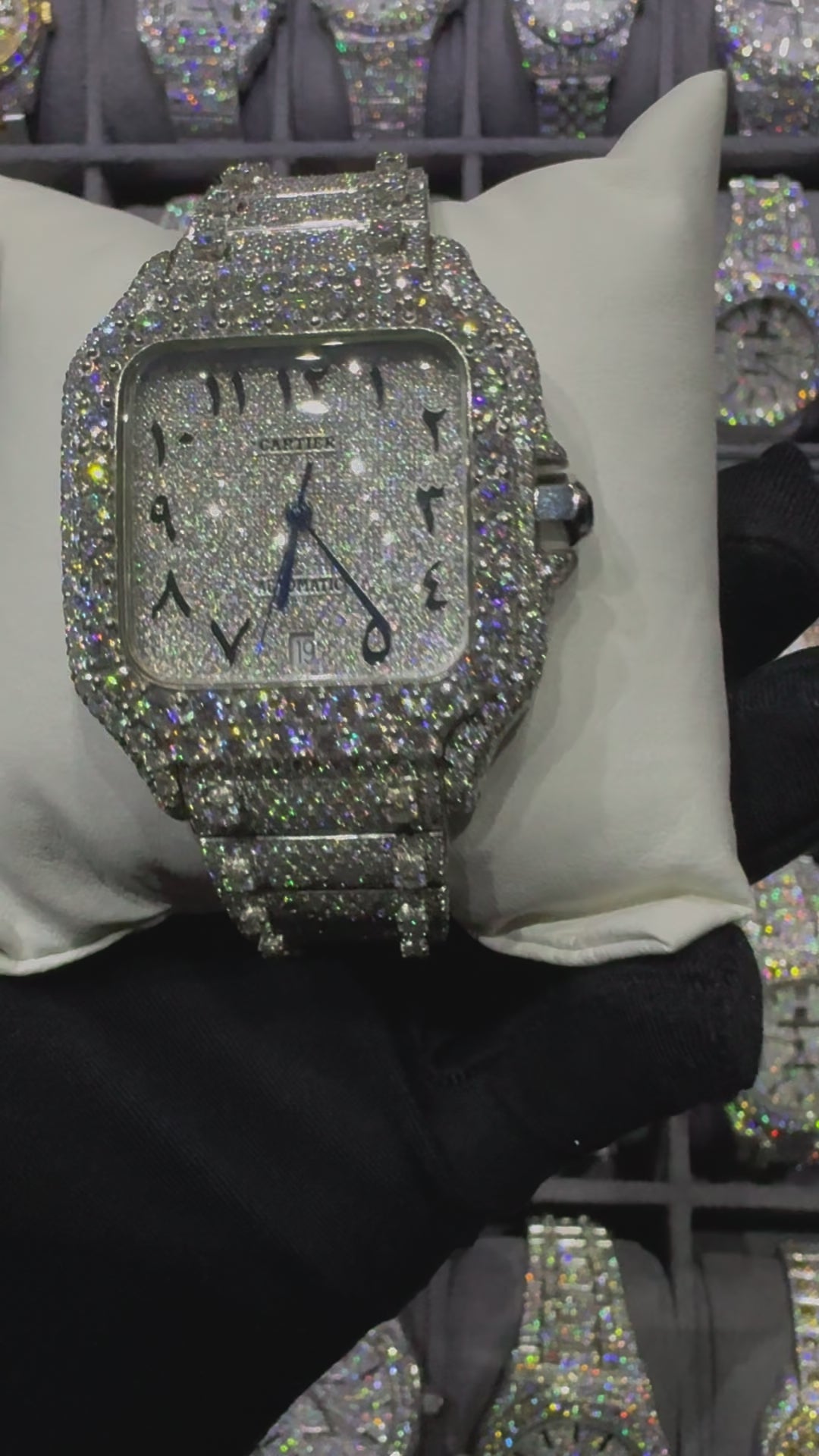 White Square Arabic Dial Ball On Bend Moissanite Diamond Automatic Watch
